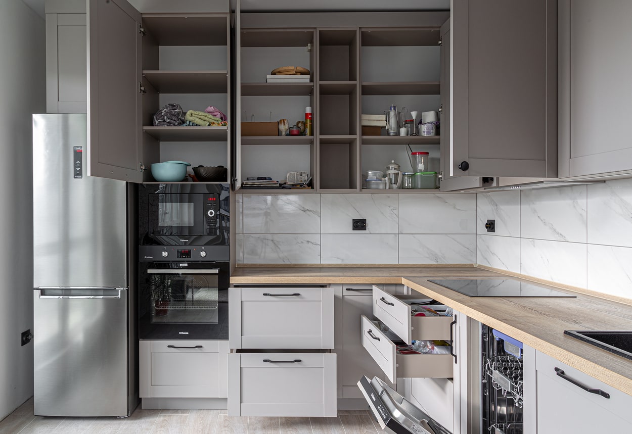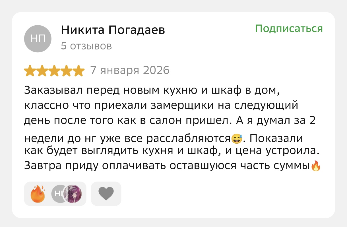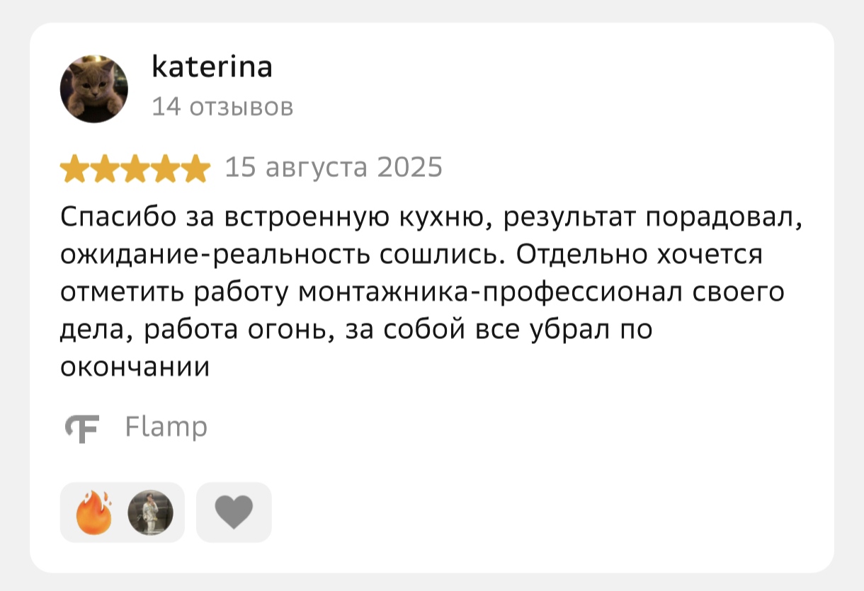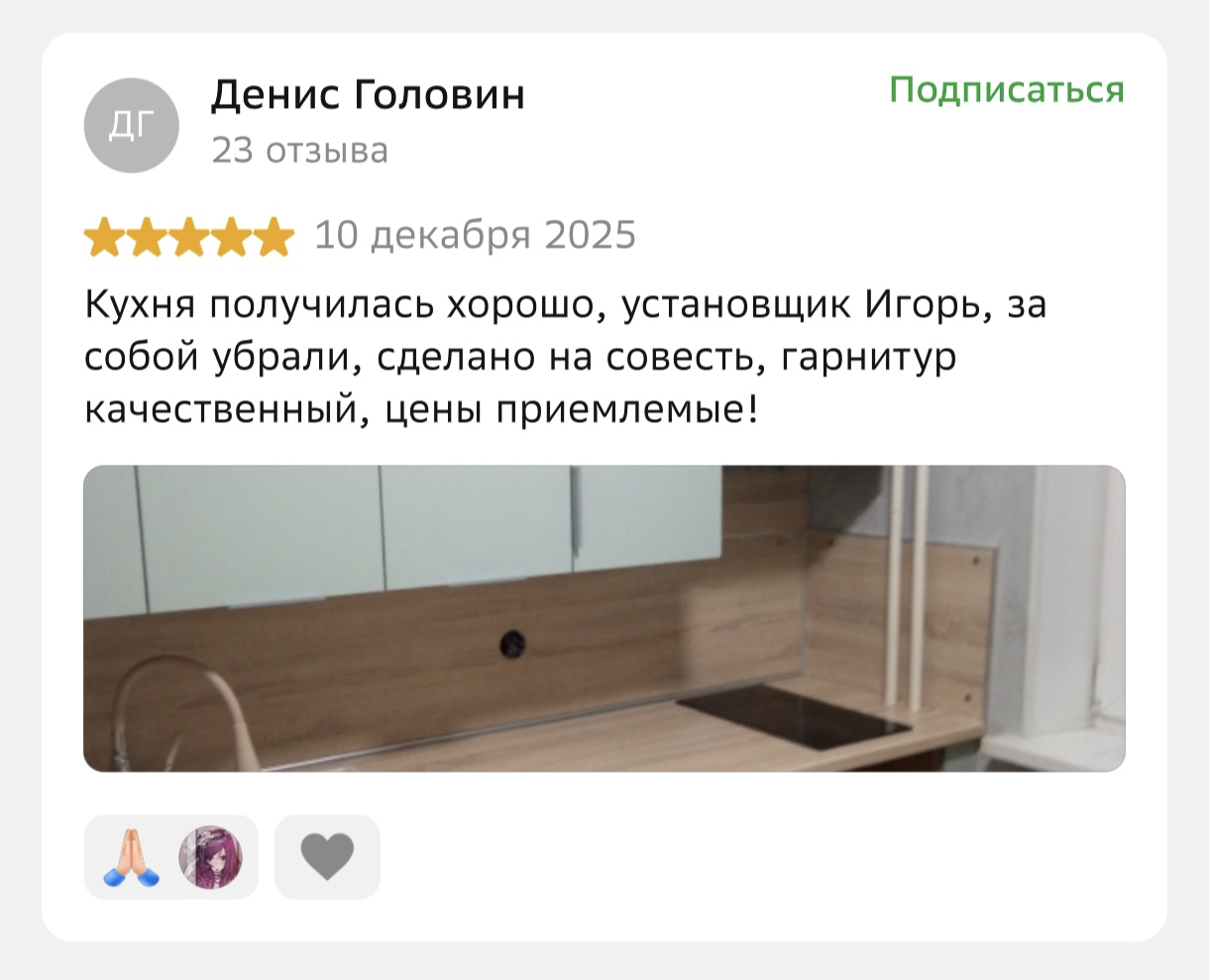 9 из 10 кухонь наших клиентов устанавливаются в новостройках. Наша бригада монтажников со стажем более 7 лет знает как устанавливать кухни, не повреждая пол и стены